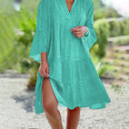 Tragen Sie den boho-chic Stil mit Mia, einem geraden Kleid aus Baumwollmischung mit geo-Muster. Sein lockerer und fließender Schnitt, sein V-Ausschnitt und seine 3/4 weiten Ärmel bieten Komfort und Eleganz im Alltag. Perfekt für Frühling, Sommer und Herbst, es kann sowohl in der Stadt als auch im Urlaub getragen werden.